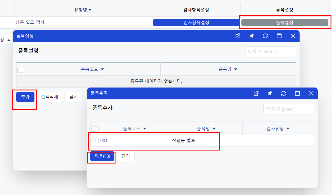 마지막으로 맨 우측 품목설정 버튼을 클릭하여 검사유형과 품목 연결 작업을 진행합니다.