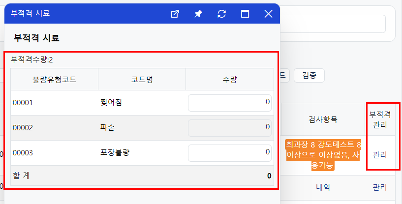 마지막 항목으로, 맨 우측 부적격수량에 대한 관리 버튼 클릭 시 부적격에 대한 사유를 기록할 수 있습니다.