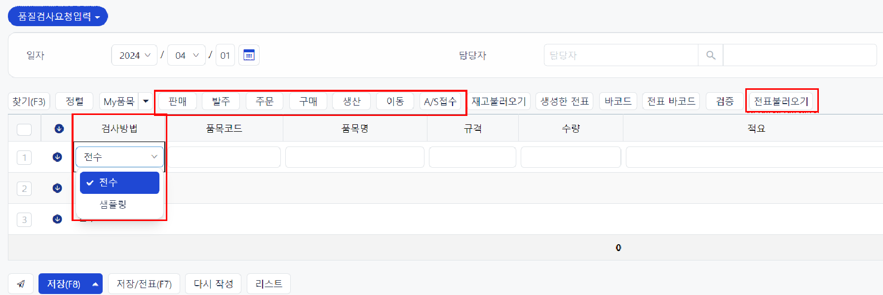 검사방법이 전수와 샘플링일 때 입력 항목에 차이가 생기게 됩니다.