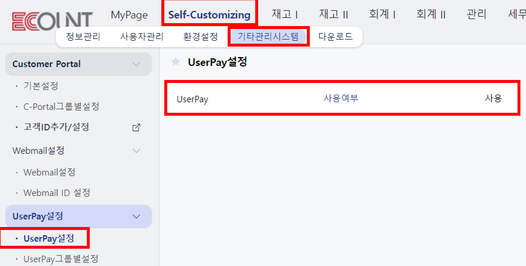 Self-Customizing - 기타관리시스템 - UserPay설정 - UserPay설정 - UserPay [사용여부]를 클릭하여 회사 전체 사원에 대한 UserPay 사용여부의 기본값을 '사용'으로 선택합니다.