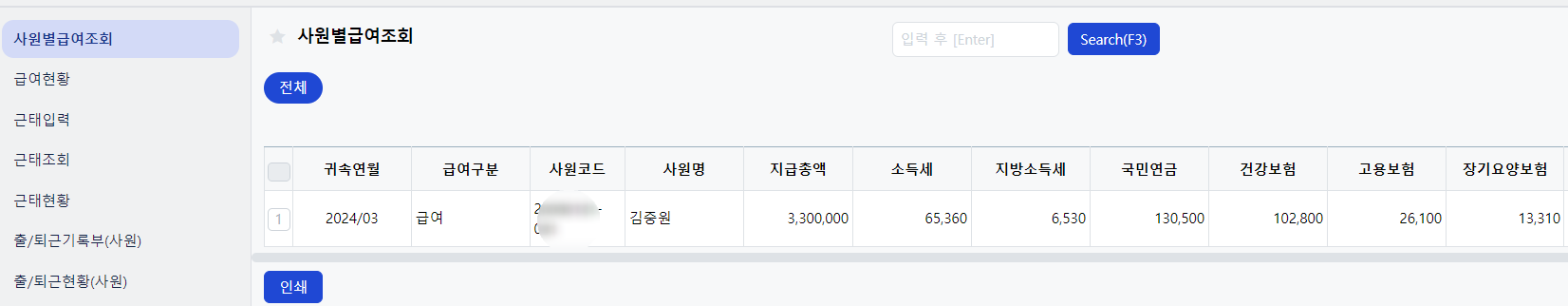 위 화면과 같이, 유저페이를 통하여 급여내역을 확인할 수 있으며, 명세서 출력이 필요하다면 번호 체크 후, 하단 [인쇄]버튼 클릭하면 각각 명세서를 출력할 수 있습니다.