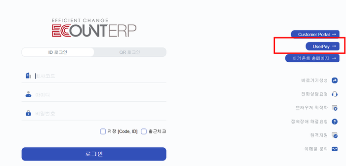 1) 유저페이 URL주소(http://pay.ecount.com)로 접속하거나, 이카운트 로그인화면의 우측 [UserPay]를 클릭합니다.