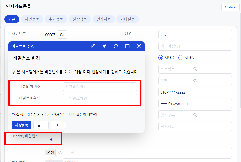 관리 - 인사관리 - 인사카드등록 - 신규 - 사원등록 및 UserPay 비밀번호 등록