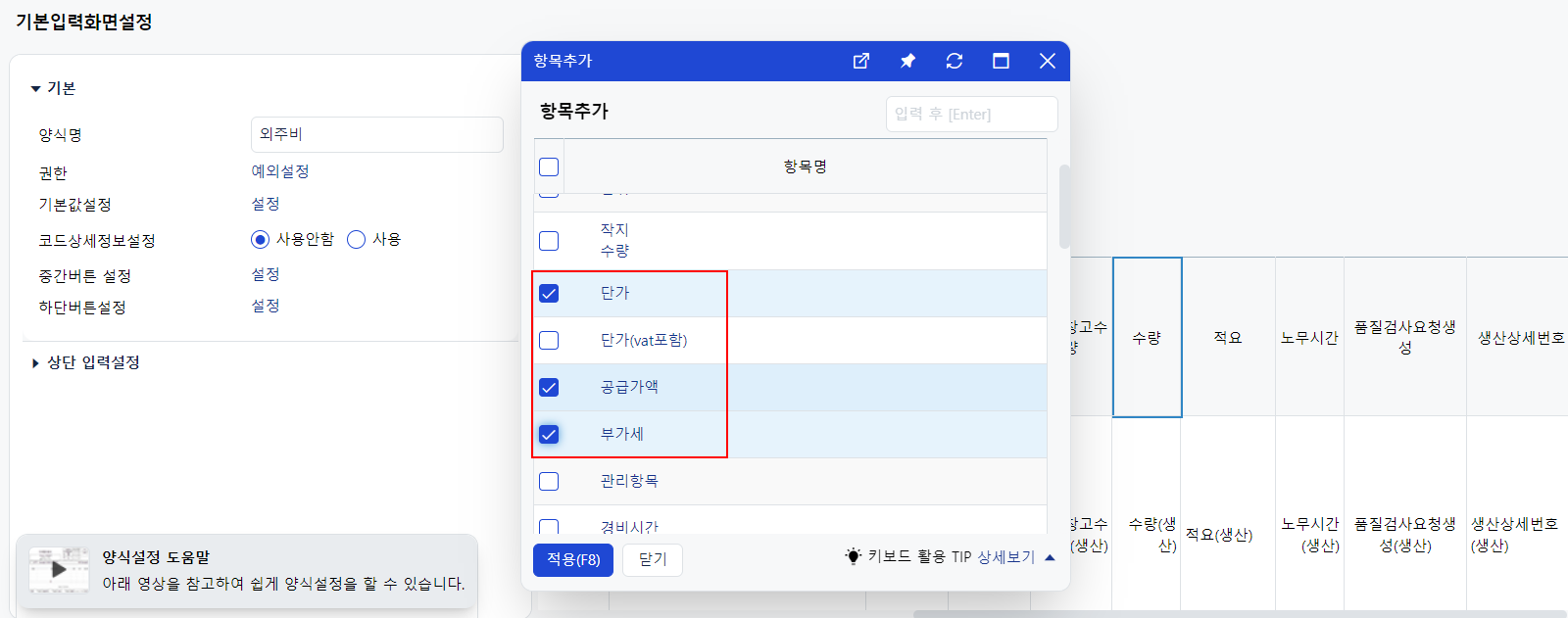 단가/공급가액/부가세 항목 추가