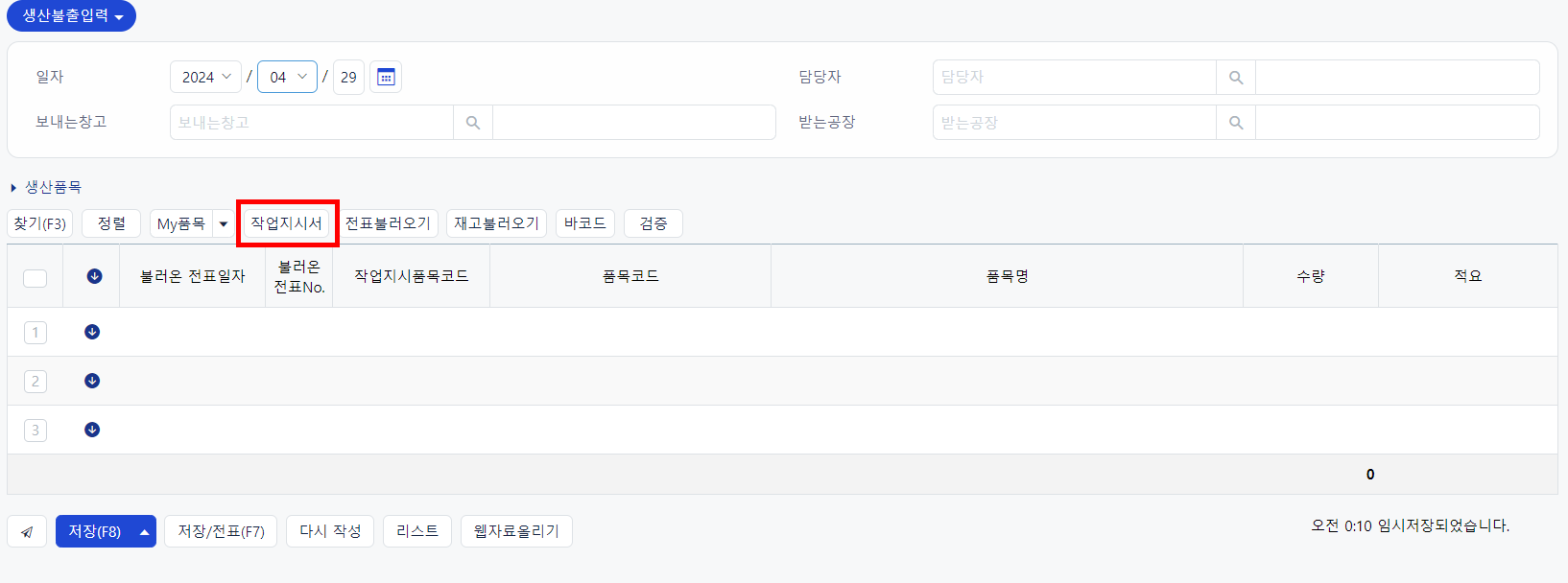 1) 생산불출 입력시 불러오기