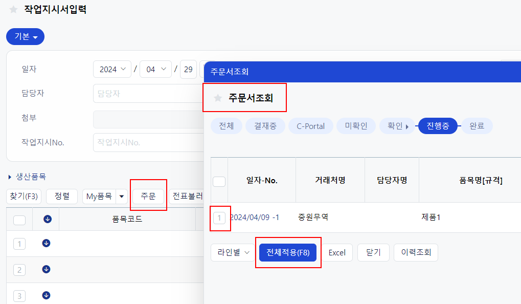 위 사진의 순서처럼 중간 주문 버튼을 누르면, 거래처로부터 받아온 주문 기준으로 작업지시서를 입력할 수 있습니다.