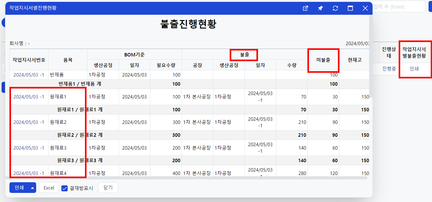 작업지시서 조회메뉴에서 미불출 수량을 확인할 수 있습니다.