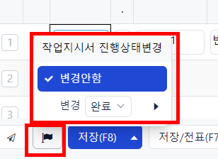또한, 생산입고 처리 시 하단 깃발모양 버튼을 통해 작업지시서의 진행상태를 변경해줄 수 있습니다.