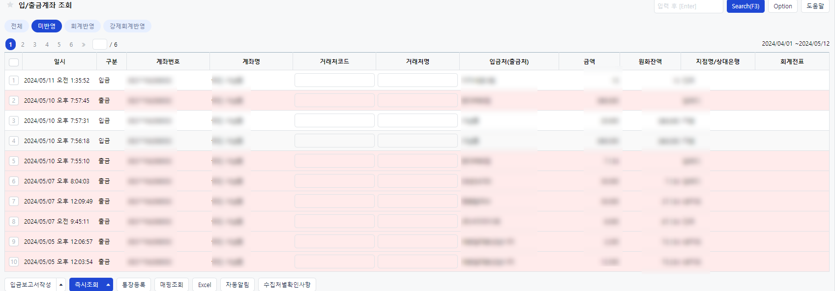 통장 연동한 화면의 상단부분(리스트탭)에 전체, 미반영, 회계반영, 강제회계반영이라고 나와있습니다.
