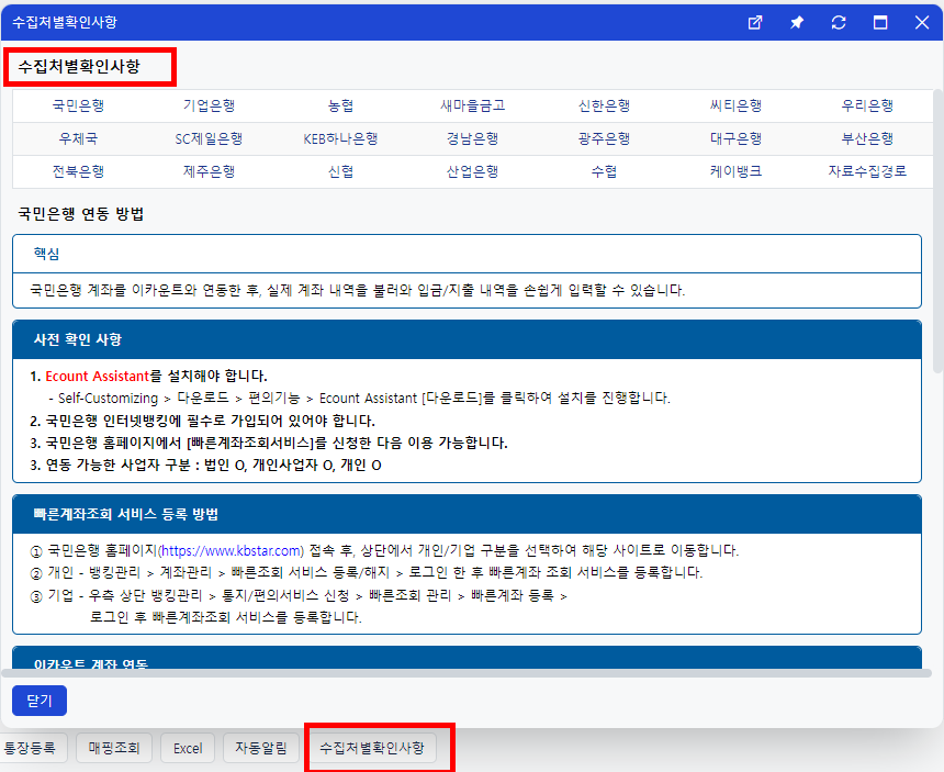 하단 수집처별확인사항을 클릭하면 은행별 등록 및 연동 방법이 있습니다.
