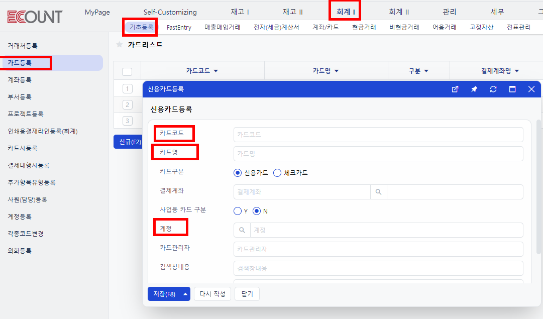 회계Ⅰ- 기초등록 - 카드등록 을 진행합니다.