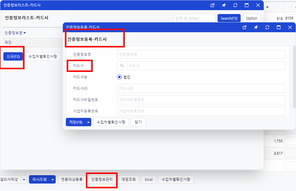 카드매입조회의 경우 인증정보관리라는 버튼을 통해 카드사를 등록하는 단계가 필요합니다.