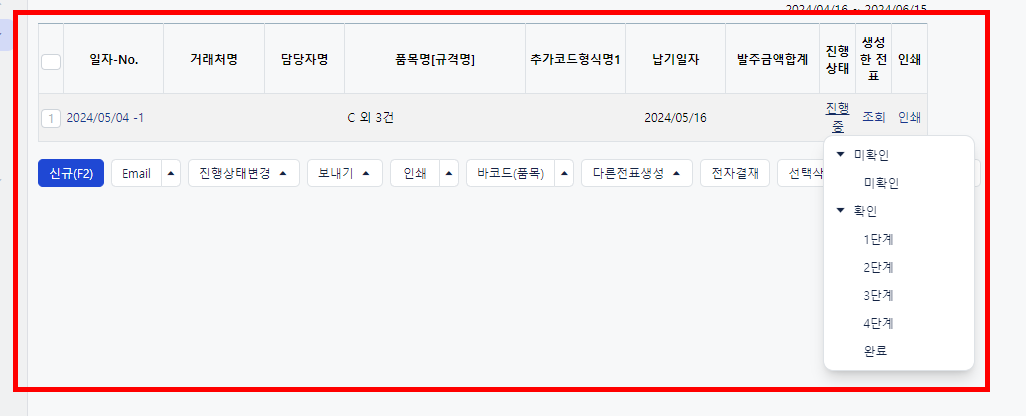 또한, 발주서의 진행단계 변경은 발주서 조회 메뉴에서 손쉽게 할 수 있습니다.