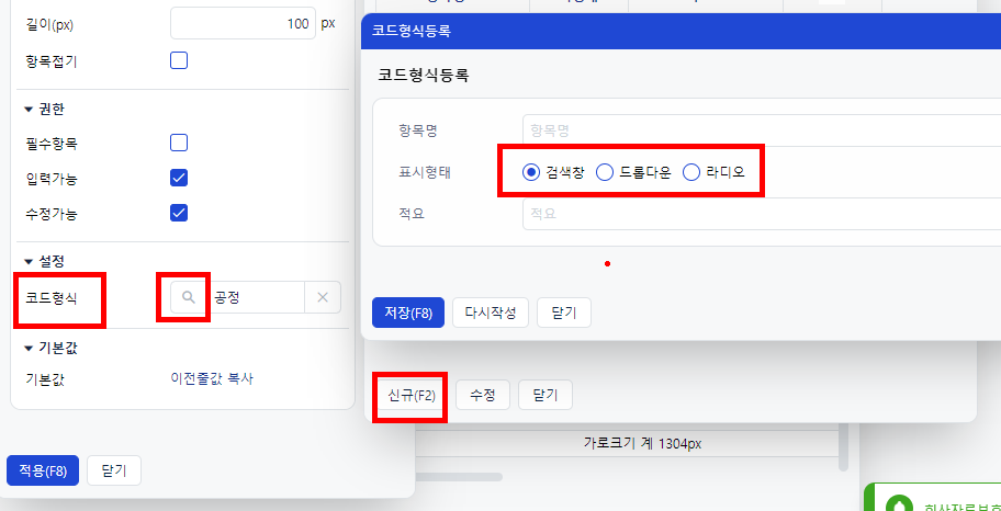위 순서로 코드형식을 등록 하면, 입력화면의 코드형식에 맞춰 반영이 됩니다.