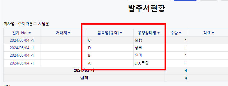 즉, 상단의 단계에 공정이 들어간다면, 현재 우리가 발주서 넣었던 제품이 어떤 단계인지 한눈에 알아볼 수 있습니다.