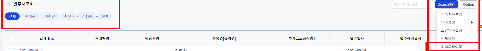 위 경우에는 리스트 탭을 사용하는 부분은 한계가 있기에 이 때는 발주서의 입력화면 하단에 양식설정을 통해 관리하는 방식을 적용했습니다.