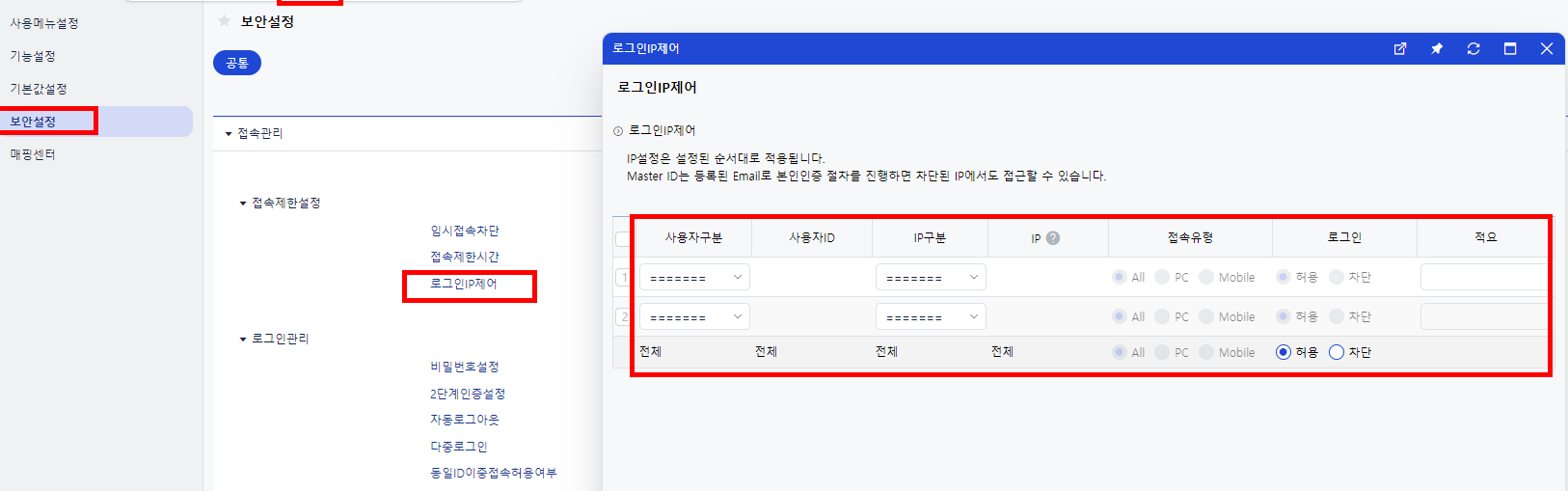 다음으로, IP또한 개별, 그룹, 전체로 지정하여 허용 또는 제한할 IP를 설정한 이후 접속유형을 잡아 PC/모바일 선택합니다.