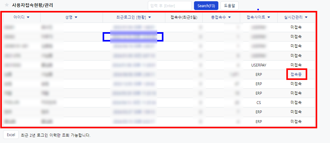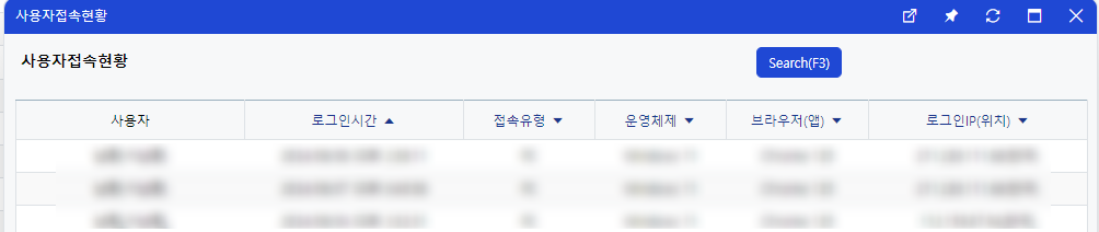 추가로, 위 화면에서 최근로그인[현황]을 클릭하면 아래 화면과 같이 사용자접속현황 확인이 가능하며, 언제 로그인했고, PC/Mobile 중 접속기기를 확인할 수 있습니다.