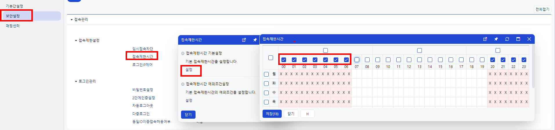 경로 : Self-Customizing - 환경설정 - 보안설정 - 접속제한시간 설정 클릭