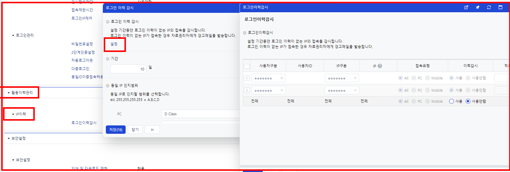 경로 : Self-Customizing - 환경설정 - 활동이력관리 - IP이력 - 로그인이력감시