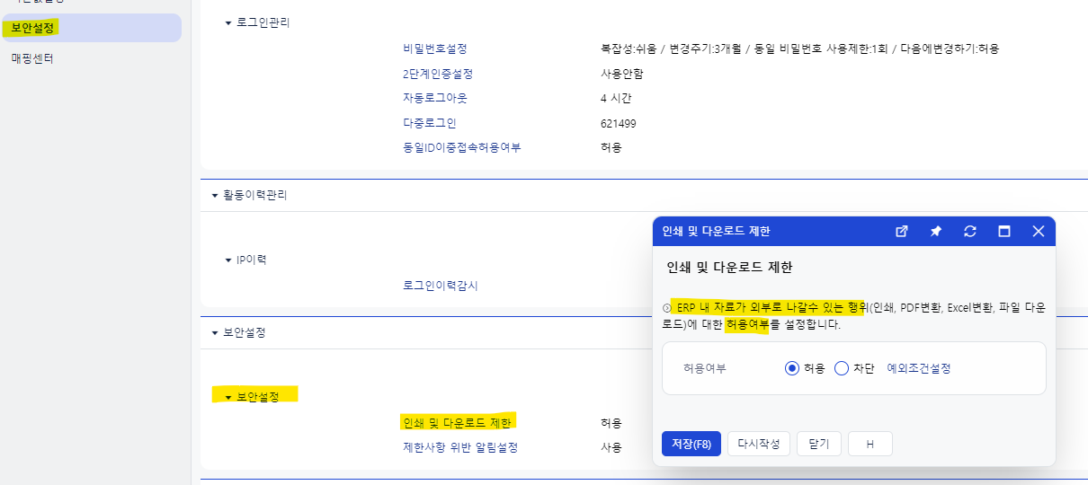 아래 화면에서 ERP 내 자료가 외부로 나가는 데이터를 제한하는 기능 설정이 가능합니다.