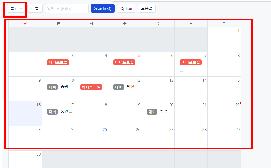 일간/월간 등 해당 일정을 일별로, 월 단위 달력형으로 조회가 가능합니다.