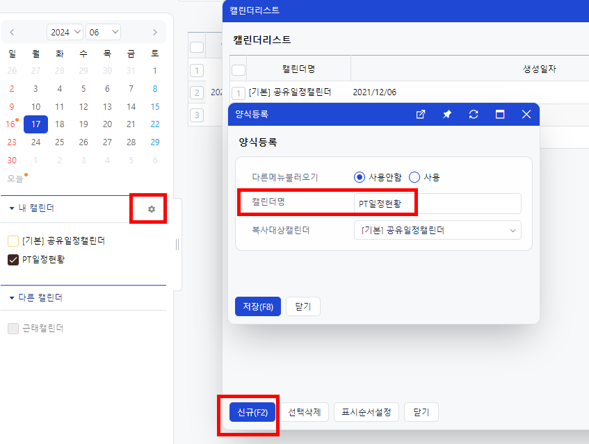 신규버튼을 클릭 해 특정 관리가 필요한 캘린더 및 개인캘린더를 등록해서 활용할 수 있습니다.