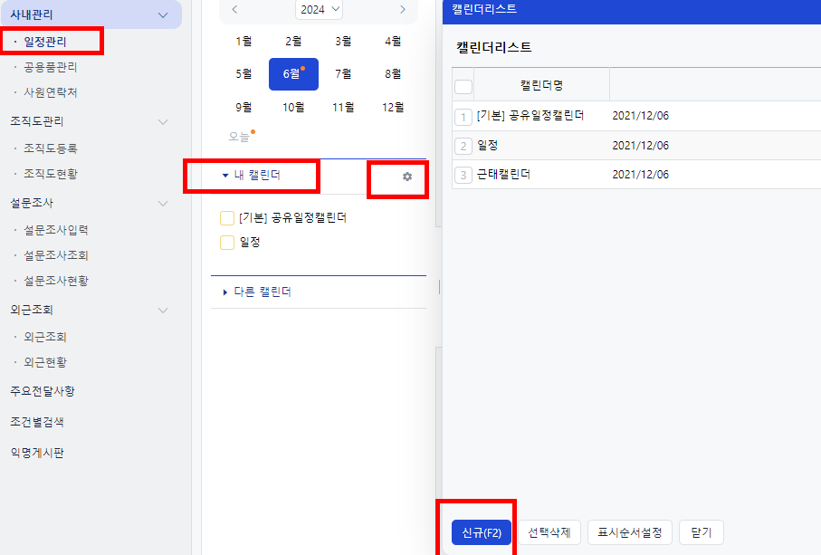 신규버튼을 클릭 해 특정 관리가 필요한 캘린더 및 개인캘린더를 등록해서 활용할 수 있습니다.