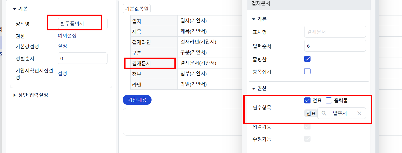 공통양식등록 - 발주품의서 클릭 - 해당 양식에 발주서입력을 필수로 할 수 있습니다.