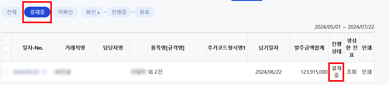 전자결재가 진행되는 경우 해당 발주서는 진행중 탭에 위치하지 않고, 결재중 탭으로 이동하게 됩니다.