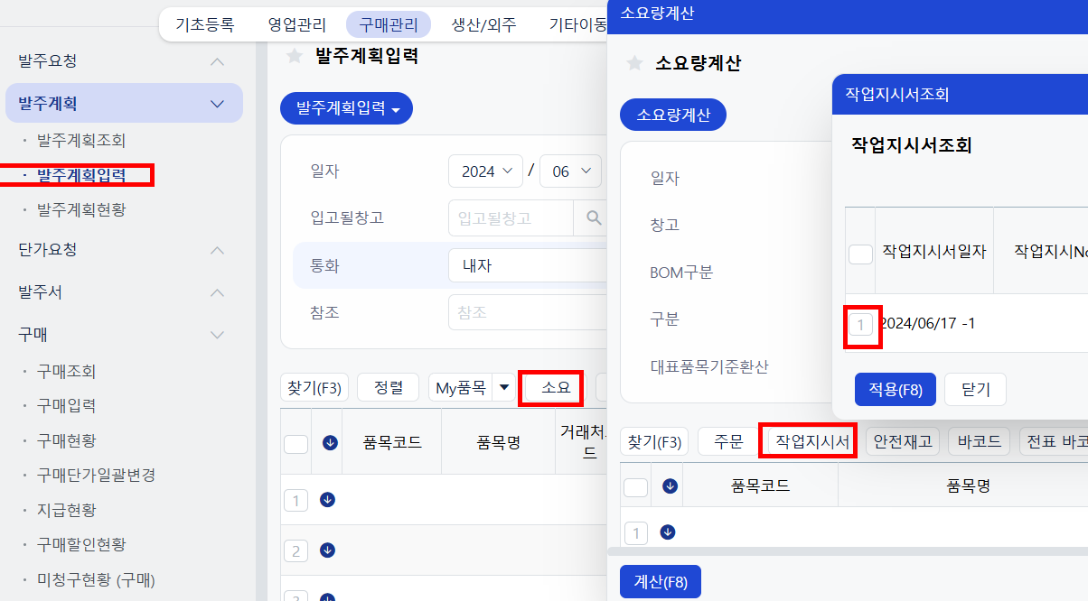 위 글과 같이 발주계획을 입력하는 경우, 중간 소요 버튼을 클릭하여 소요량 계산 메뉴를 불러오고, 해당 계산을 작업지시서 기준으로 발주계획을 만들 수 있습니다.