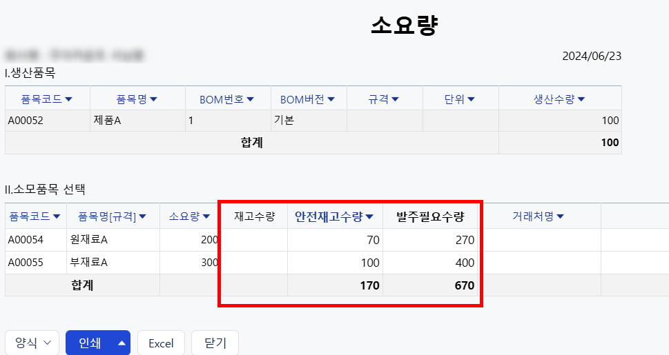 소요량계산 메뉴는 제품/반제품을 생산하는데에 필요한 자재의 소모 수량과 현재 재고수량을 미리 확인해볼 수 있습니다.