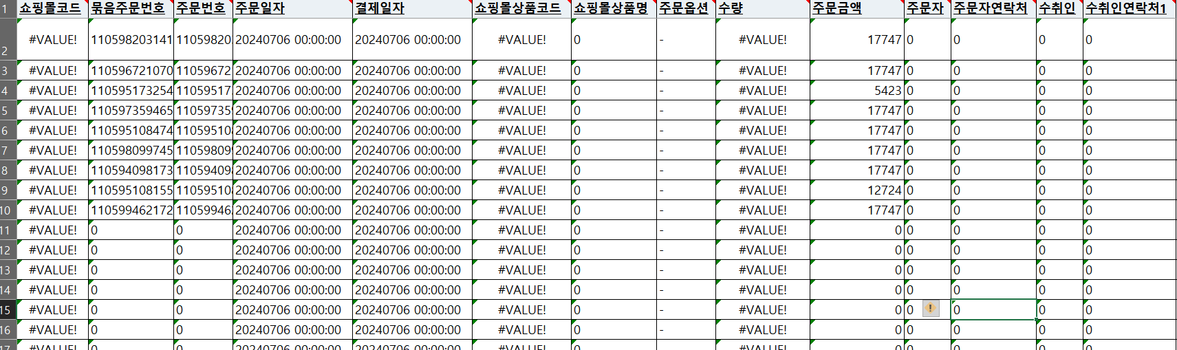 예를들어, 업무시간 내 15시,16시에 당일 쇼핑몰 주문건에 대해 종합해 이카운트 주문수집으로 넘기는 경우에 해당 엑셀 기능을 활용해 업로드 할 수 있습니다.