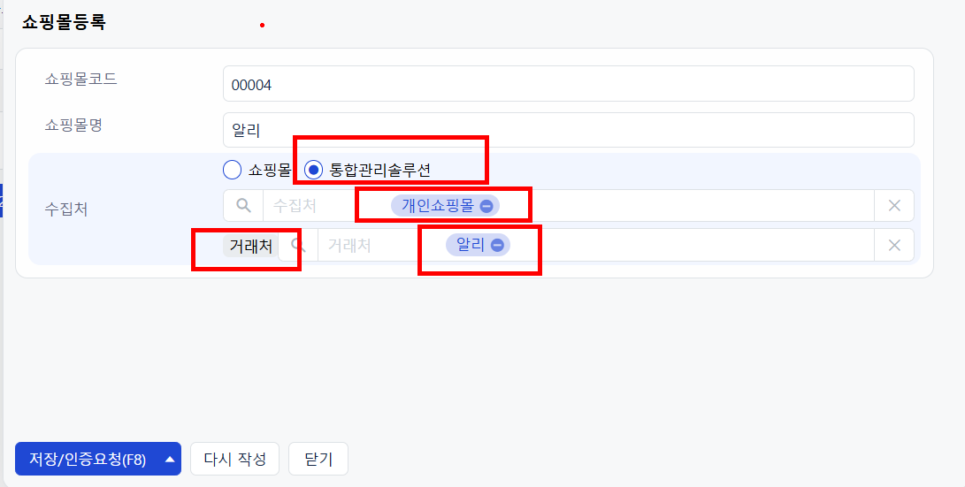 단, 알리, 테무는 이카운트에서 제공되는 쇼핑몰이 아니므로, 아래 사진처럼 구분 값은 통합관리솔루션 / 수집처는 개인쇼핑몰 / 거래처는 이카운트에 등록한 알리로 등록해 연결합니다.