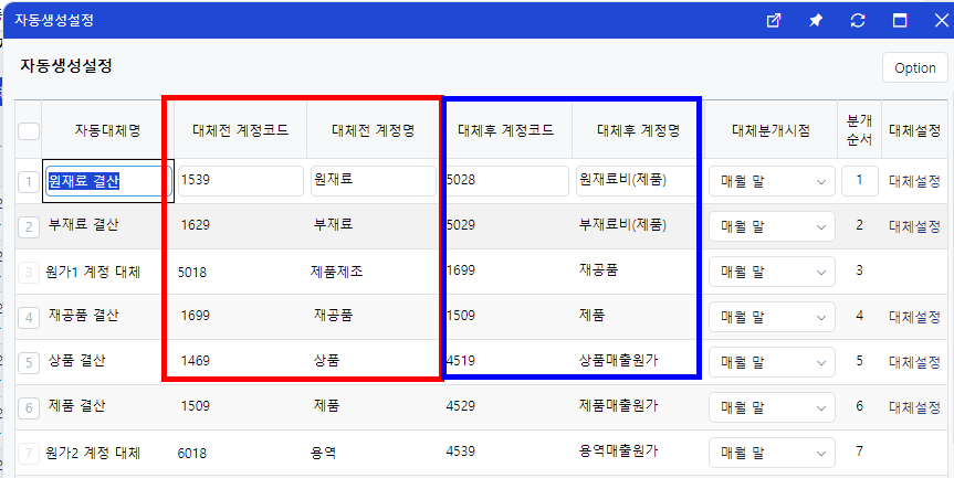즉, 원재료라는 계정을 등록했다면, 원재료비라는 계정으로 대체분개가 되어 원가 관리가 가능합니다.