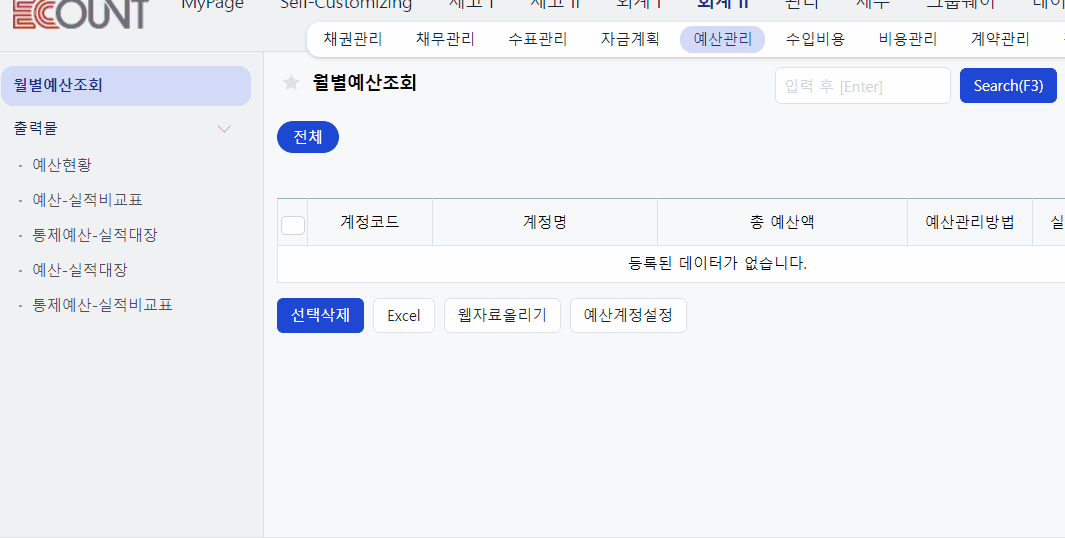 계정별로 금액 한도를 제한하고 확인하는 메뉴가 예산관리 메뉴입니다.