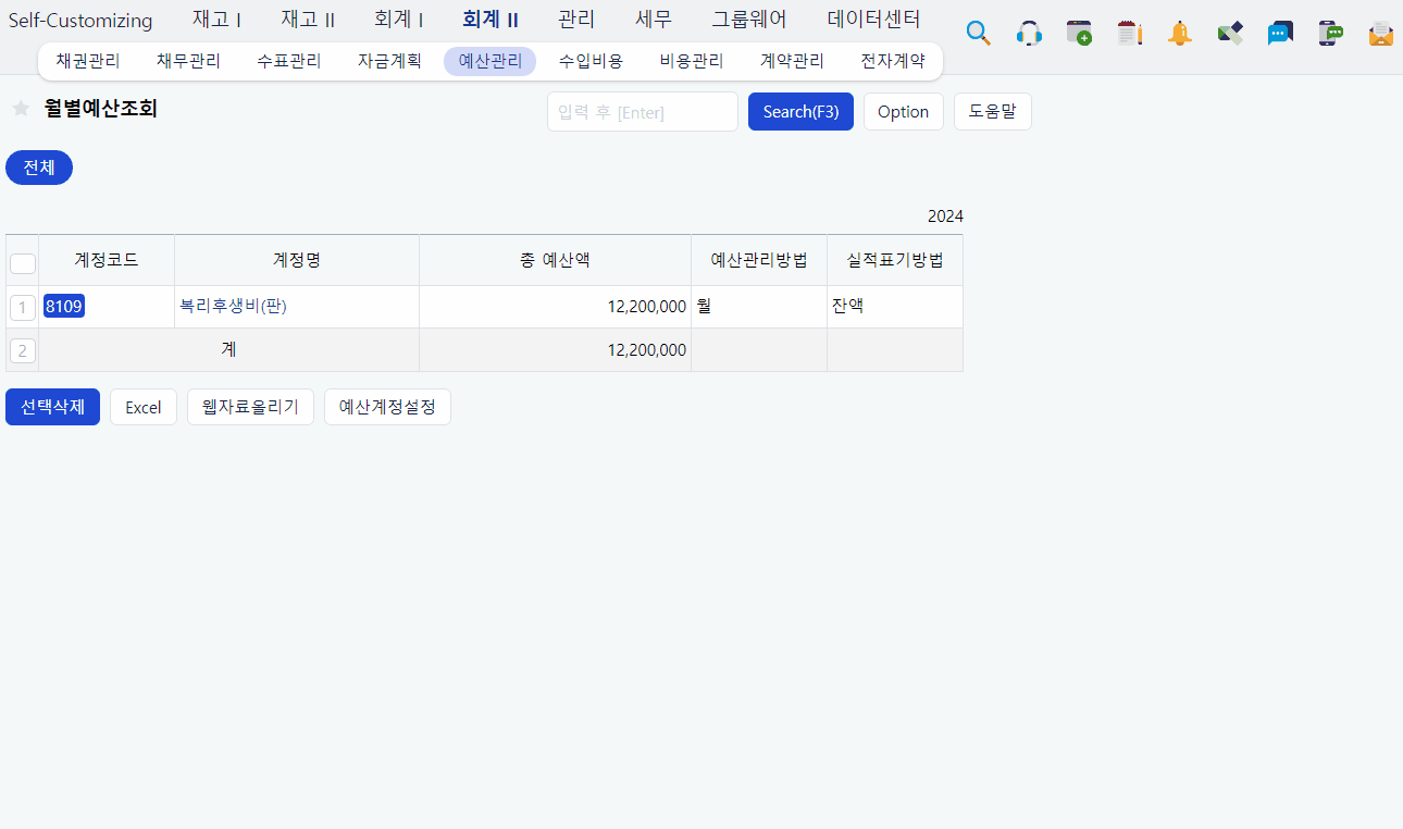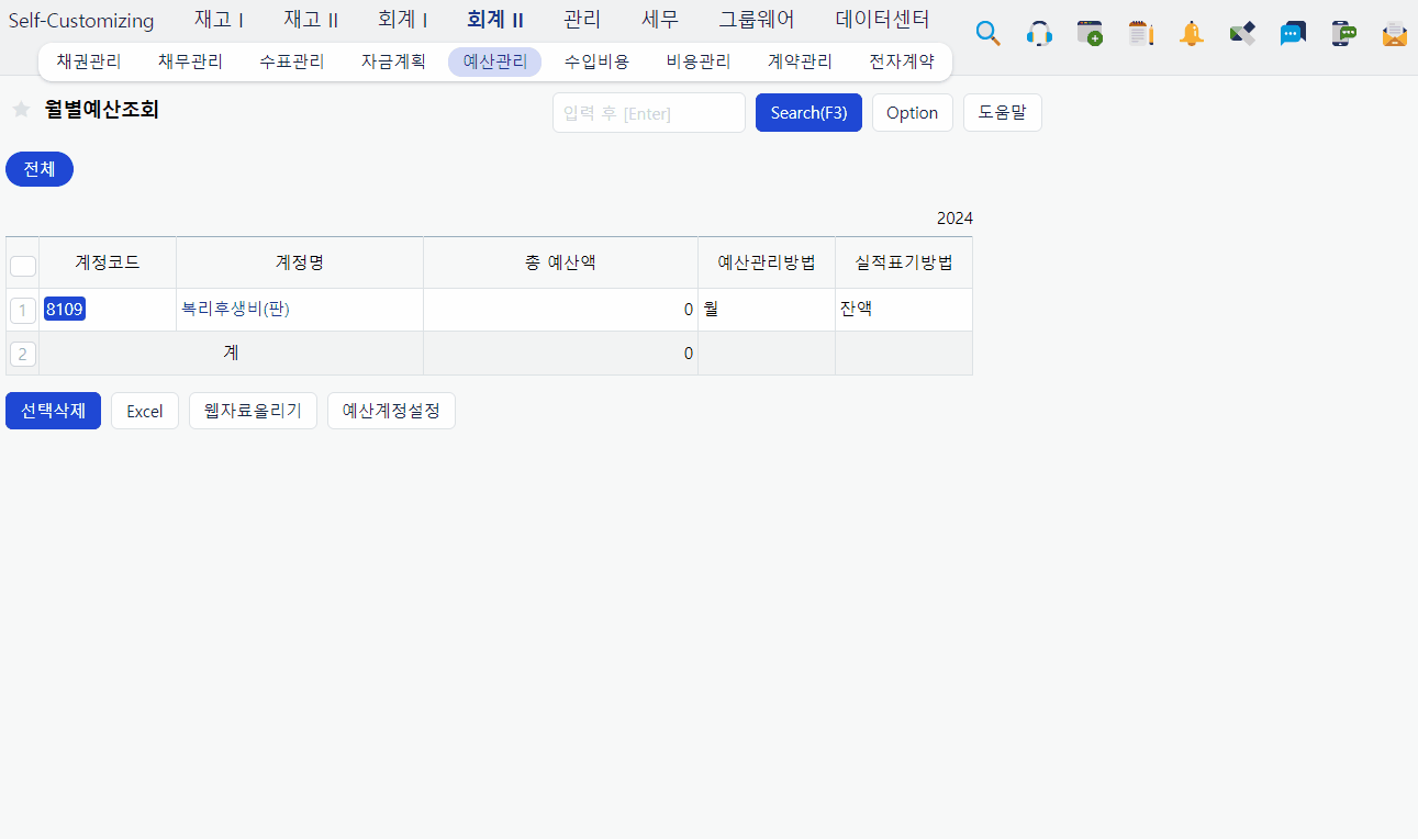 즉, 예산관리 메뉴를 활용하여 계정별 예산 금액을 입력하고 회계전표 작성 시 해당 계정의 한도를 체크할 수 있습니다.
