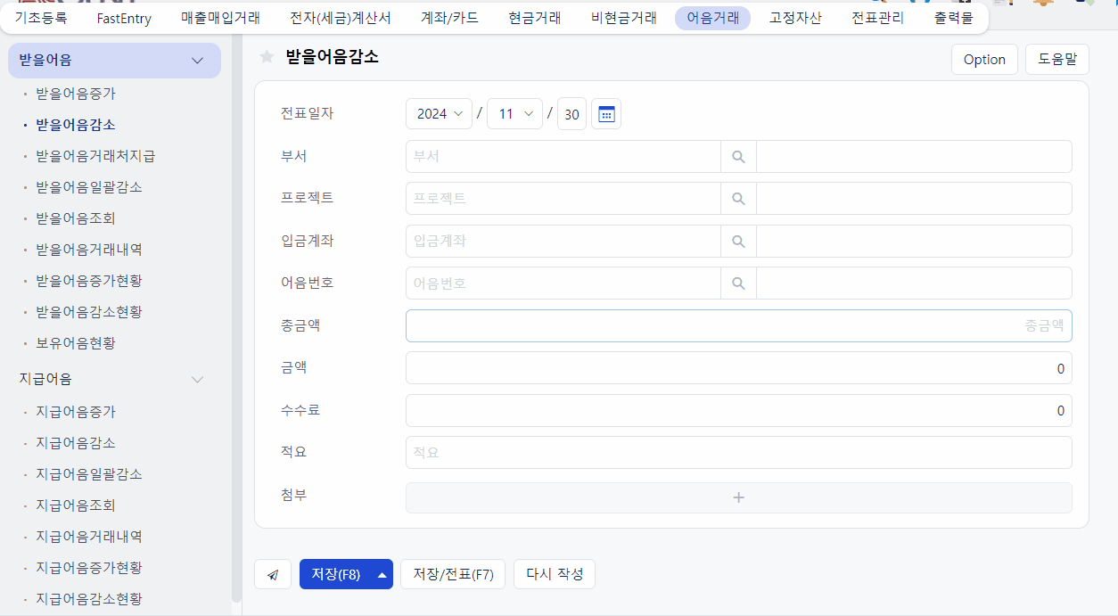 입금계좌 및 어음번호를 입력 후 입금된 금액까지 입력 후 저장하면 됩니다.