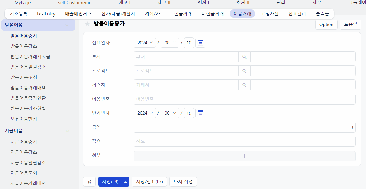 어음거래 메뉴의 이름은 직관적으로 표기가 되어있습니다. 따라서, 어음이 증가하는 경우/배서한 경우/지급한 경우에 따라 메뉴 활용이 중요합니다.