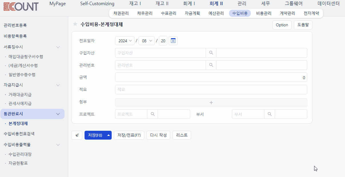 비용항목이 추가로 필요한 경우, 회계Ⅱ - 수입비용 - 비용항목등록 메뉴에서 추가 가능합니다.