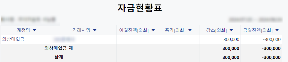 관세사에지급 메뉴에 입력이 되면 분개는 외상매입금에 대해 금액을 지급한 내용으로 나오게 되며, 아래 사진과 같이 자금현황표 조회 시 관세사에 대한 외상매입금 잔액은 마이너스로 확인할 수 있습니다.
