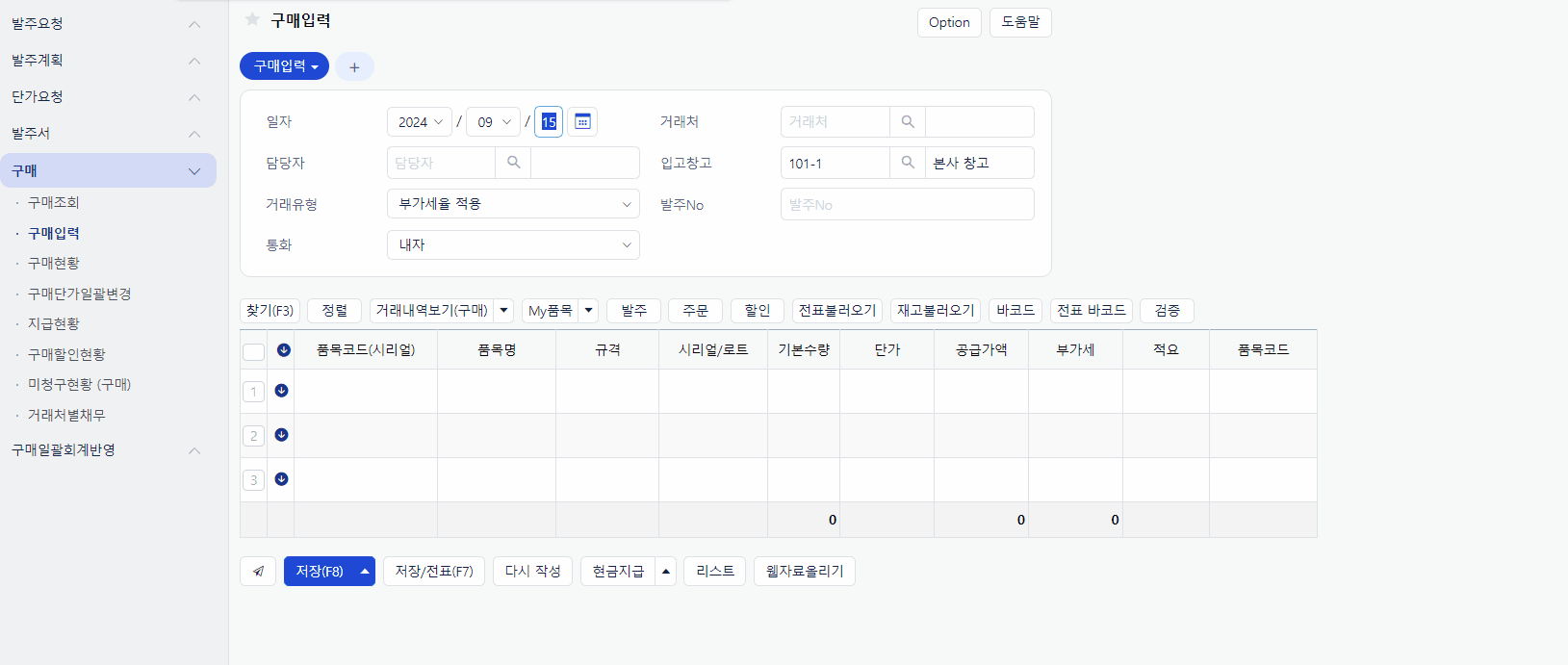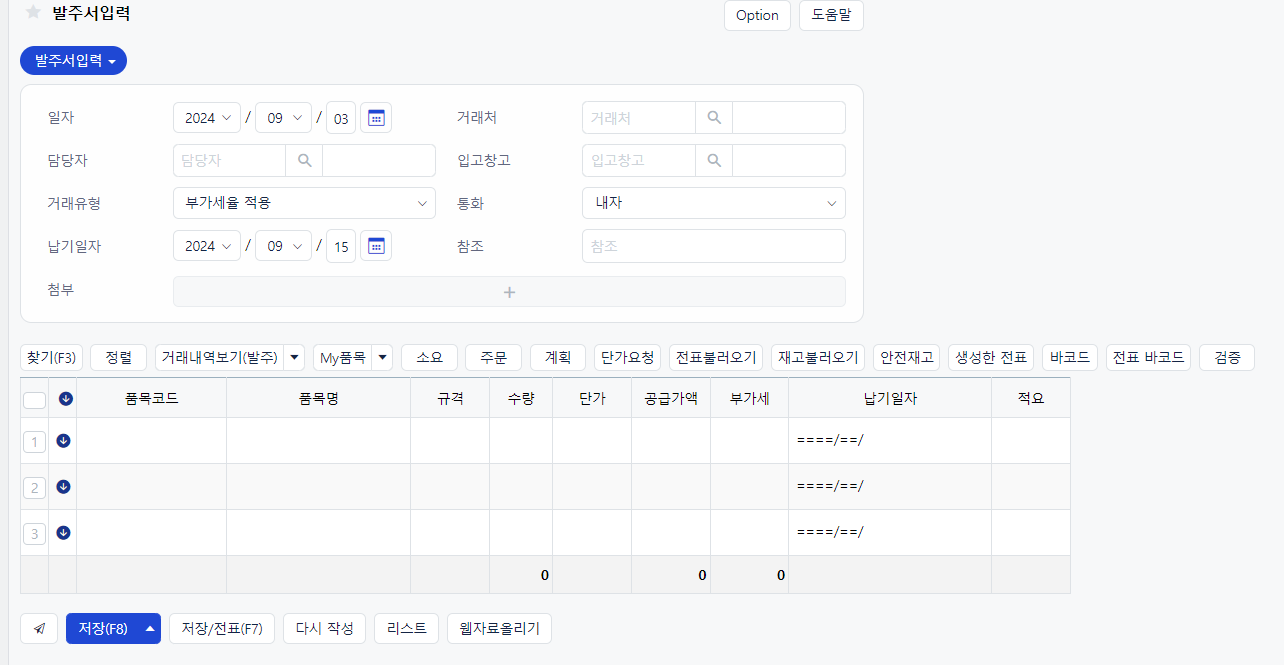 거래처, 창고, 품목코드, 수량 등 입력해 발주서를 생성합니다. 이 때, 해당 발주서를 구매입력 시 불러와 입력 처리를 하겠습니다.