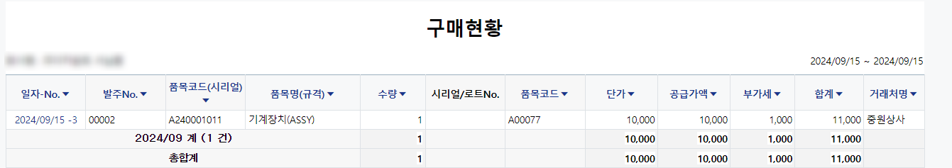 하단 구매현황에서 품목코드(시리얼)은 새로 등록한 시리얼을 입력한 구매입력에서의 품목코드 자리입니다.