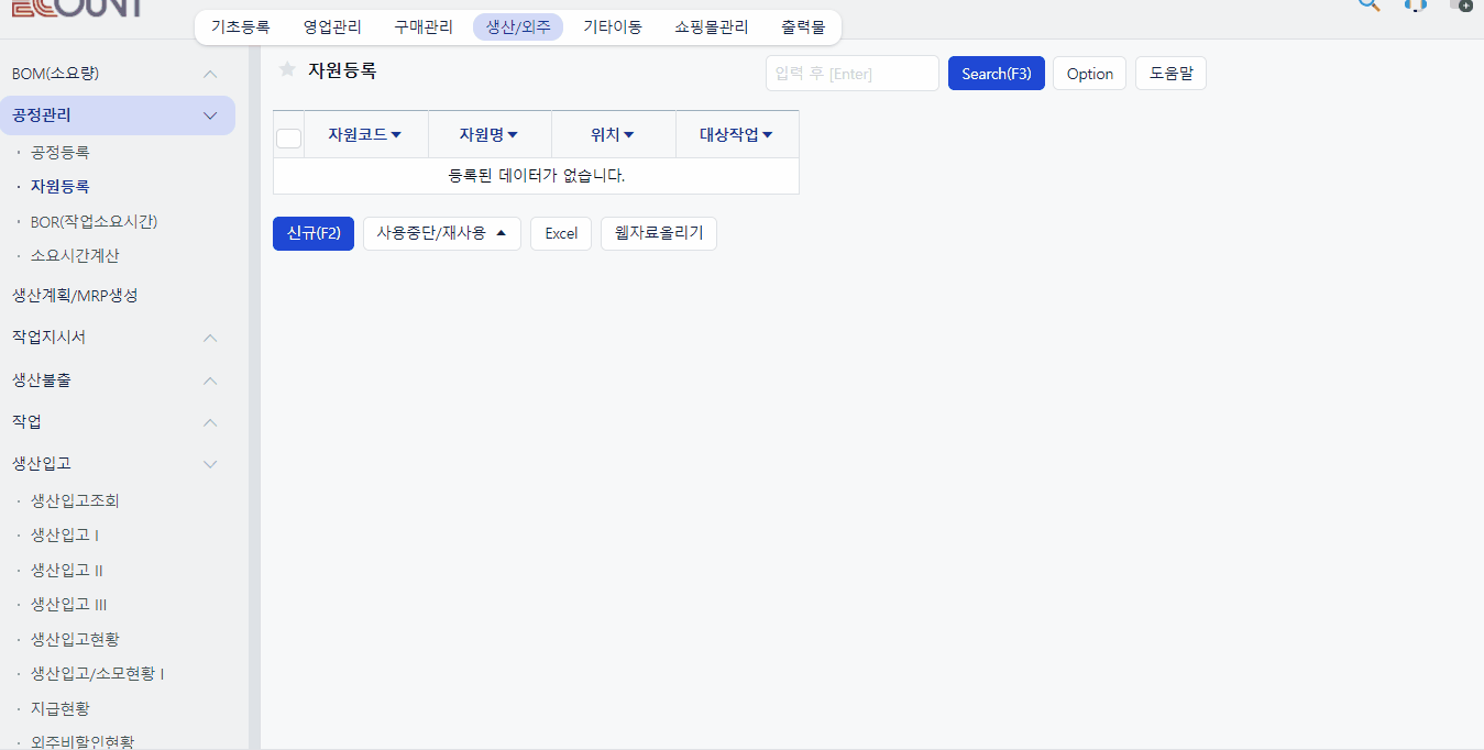 등록한 공정과 작업에 대한 자원코드, 자원명, 위치 및 작업을 입력하여 저장하는 메뉴입니다.