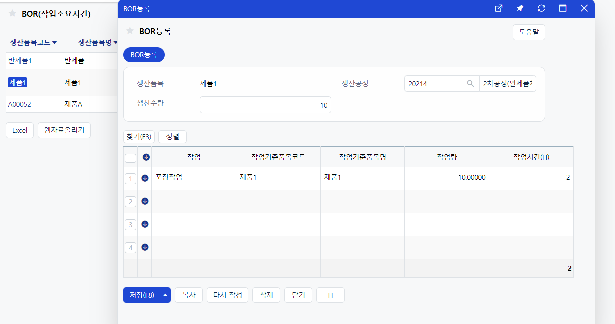 제품, 반제품에 대한 작업 연결 및 생산수량 대비 작업시간을 입력해 저장합니다.