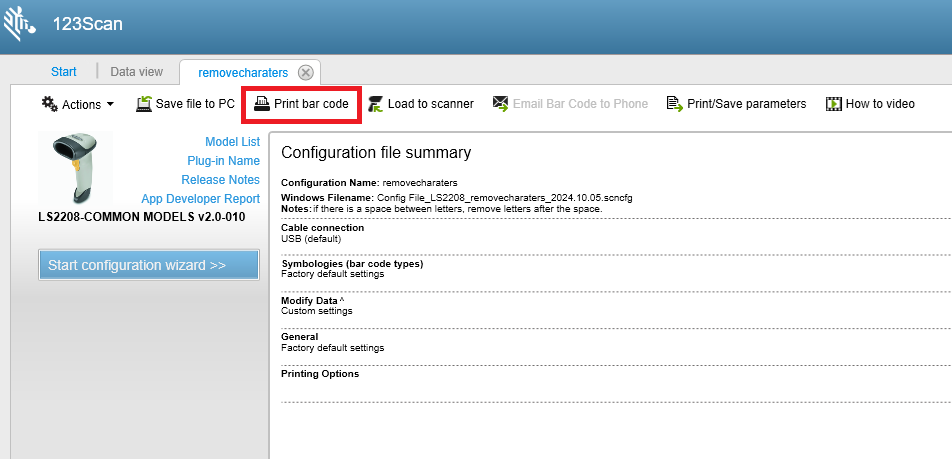 Print bar code를 클릭하여 생성된 설정 바코드를 인쇄합니다.