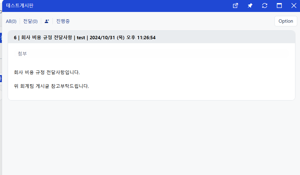 회사 비용 규정에 대한 게시글을 회계팀 게시판에서 불러올 때 아래의 영상의 설정처럼 게시글 내용을 불러 올 수 있습니다.