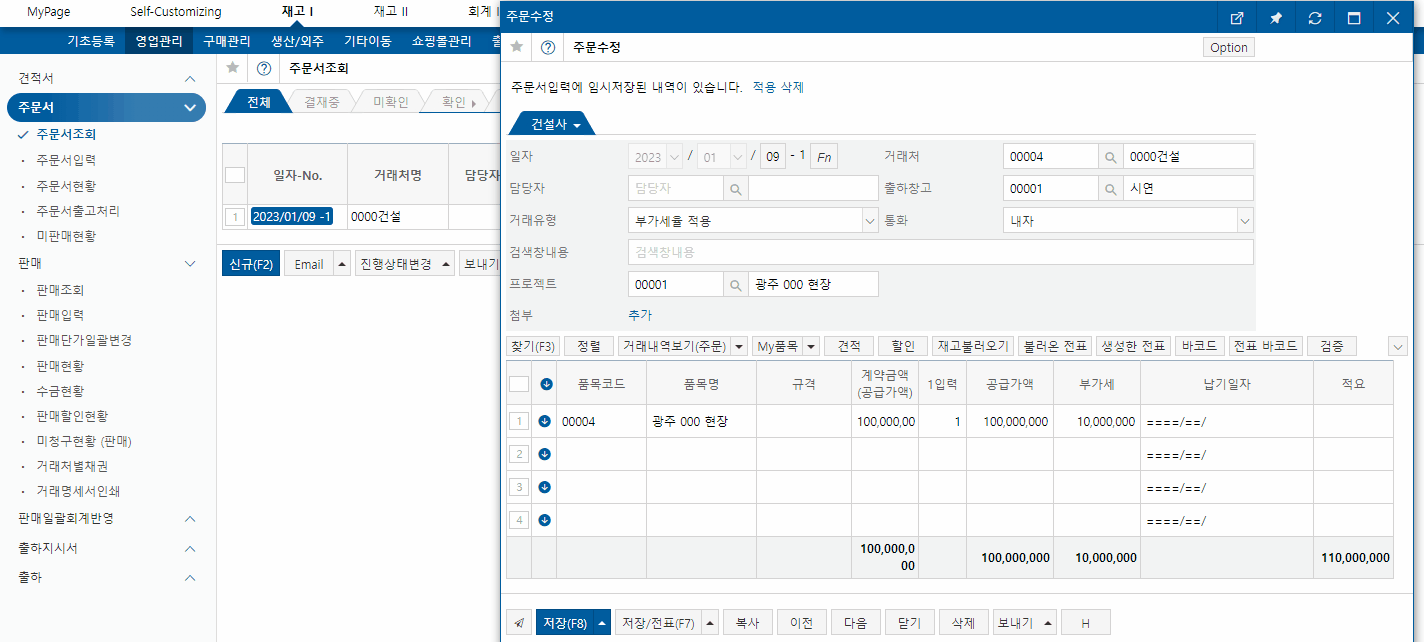 계약 금액을 주문서에 입력한 이후 세금계산서(혹은 거래명세서)를 발행하시는 경우 판매입력에서 해당 계약서가 입력된 주문서 전표를 불러옵니다.