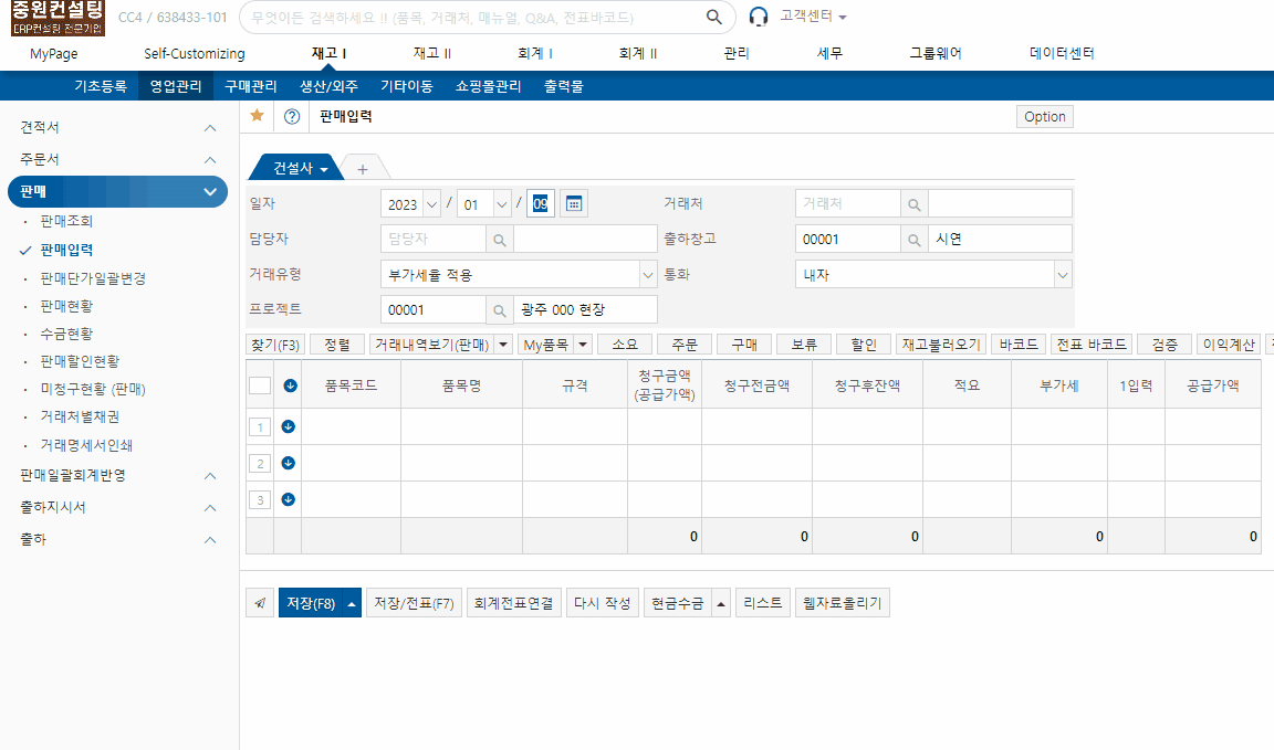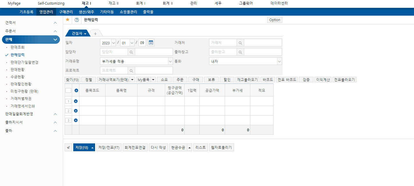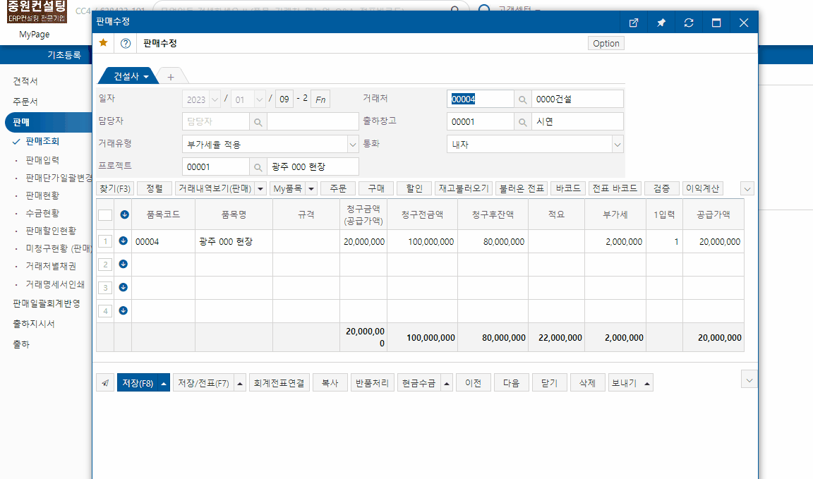 최초 계약금 외에도 중도금, 잔금에 대한 청구도 동일하게 진행하며 판매입력에 입력한 전표 내역을 매출전표를 생성하여 세금계산서 발행을 하면 됩니다.