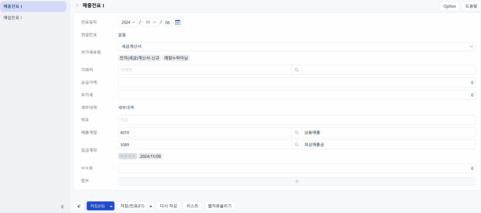 입력화면의 표기되는 기본값이 아닌, 분개 시 화면의 기본값 설정인 점 참고하시면 됩니다.